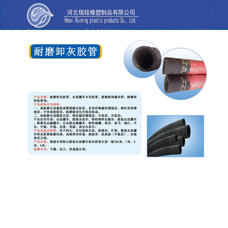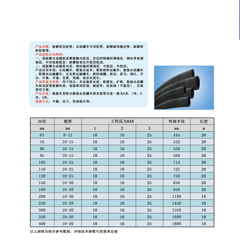 本公司主要经营水泥罐车专用卸灰管,喷沙管,气管.胶管采用科学配方,专门为散装水泥车配套使用,输送介质:水泥,灰,矿粉;此管质量上乘。是目前市场上无可比对的。本公司秉承“顾客至上,锐意进取”的经营理念,坚持“客户第一”的原则为广大客户提供优质的服务。长期备有现货