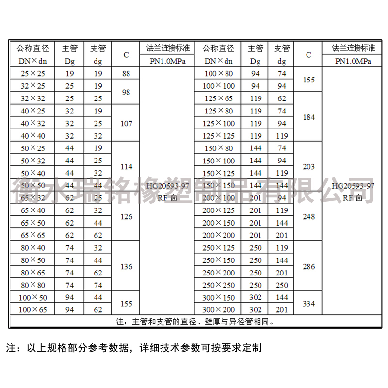 注: 本表格为等径三通四通尺寸规格表,其中异径三通根据主管规格,查本表选取各接管长度.主管大于200,或支管小于65不需要按照表中尺寸. |