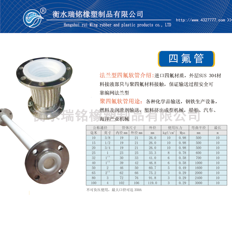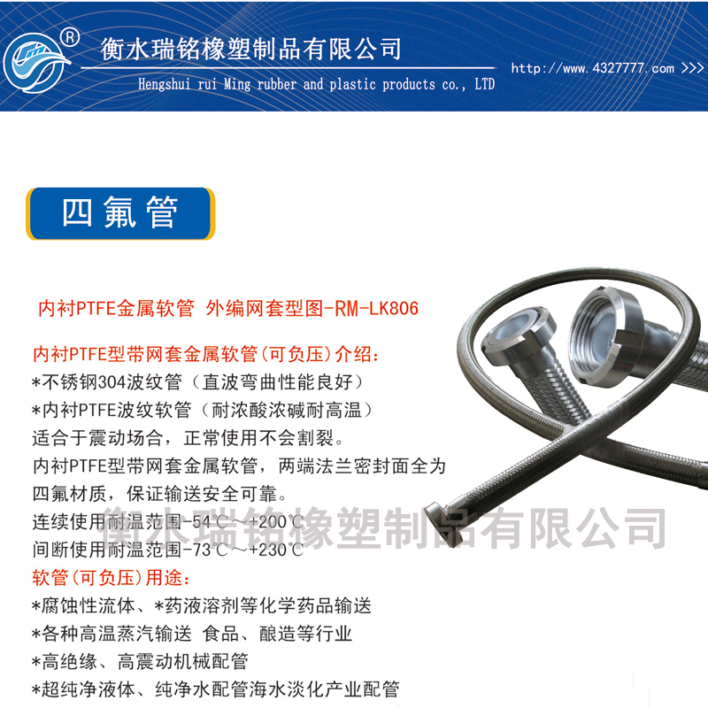 内衬四氟金属软管的应用范围:适用于高温下强烈腐蚀性气体和液体,其它类型钢塑复合管和金属管不适输送介质,钢聚四氟乙烯复。合管均适用,钢聚偏氟类复合管适用的输送工作温度在-40℃~+150℃的腐蚀性介质,如:高度的化学稳定性:能承受所有的强酸,包括王水、氢氟酸、浓盐酸、硝酸、发烟硫酸、有机酸等,强碱、强氧化剂、还原剂和各种有机溶剂的作用。非常适合高纯度化学品送料使用,腐蚀性流体、*药液溶剂等化学药品输送*各种高温蒸汽输送食品、酿造等行业高绝缘、高震动机械配管超纯净液体、纯净水配管海水淡化产业配管,广泛应用于机械、电子电器、汽车、航天、化工、电脑、电热、军事、通讯等重要科技工业,如微型变压器等。