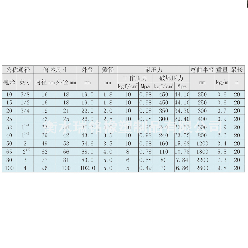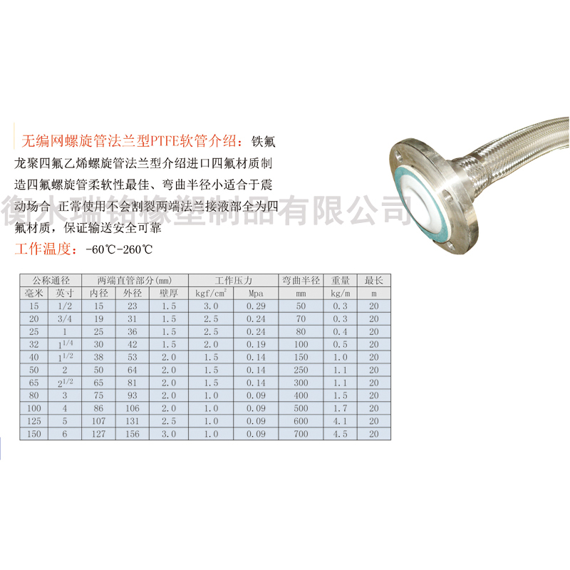内衬四氟金属软管技术参数: