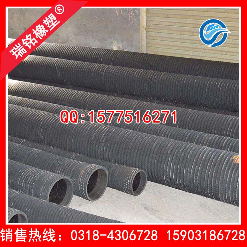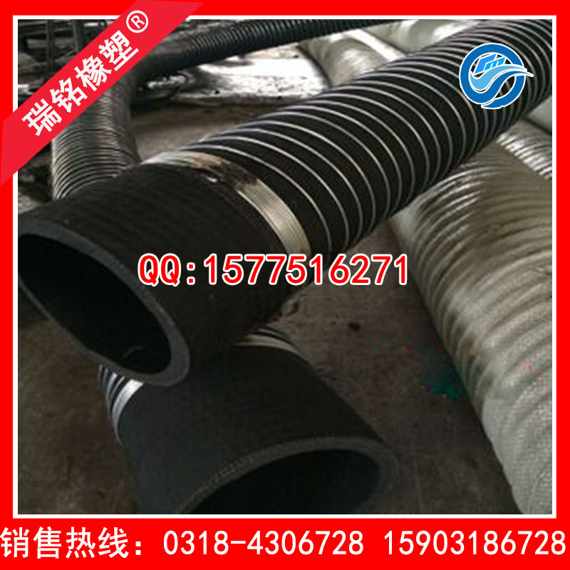 1、组成及特点:管壁由内胶层、织物层、螺旋金属钢丝、中胶层和外胶层五部分构成,管体坚固,曲挠性好。 2、分类及用途:根据胶层耐介质性质可分为吸水管、吸酸管、吸油管等,广泛应用于农业排灌、工矿、土建、水利工程等。 3、规格型号(内径):25~610mm。 4、工作压力:排泄压力:0.3Mpa 吸引压力:63Kpa以下。 5、长度:10m、6.1m(20’)、9.15m(30’)