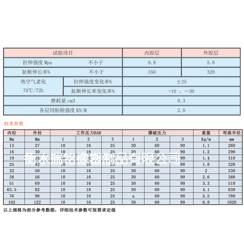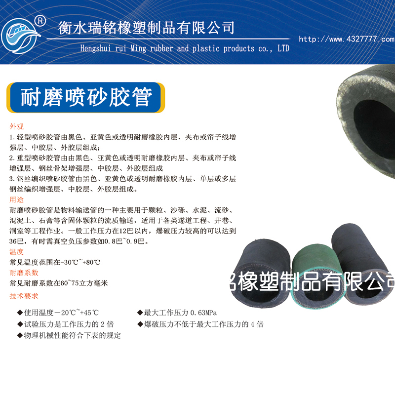 产品结构:内胶采用聚氨酯和丁基橡胶为主要原材料,并加入特殊补强剂。成品具有高耐磨、高韧性、耐高压等特点,耐磨指标是普通喷砂胶管的2-3倍。在同行业中享有“耐磨王”的美誉;增强层,喷煤粉胶管采用优质擦胶布作增强层,柔性好、承压能力强;螺旋钢丝骨架支撑,我们采用纲性优异的螺旋钢丝,并在其表面涂覆特殊活性剂使其和外胶层的硫化粘结性能加强;外胶层采用耐磨耐候的复合橡胶,保证其在苛刻恶劣的环境下不产生龟裂。