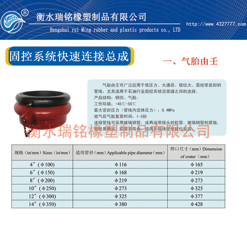 气胎由壬,简称气胎,又称由壬气胎,广泛应用于低压力、大通径、错位大、需经常装卸的管线,尤其适用于石油行业固控系统泥浆罐之间的连接。连接管线可采用玻璃钢管,或两端带接头的胶管,玻璃钢管耐腐蚀,质轻易搬运,胶管可弯曲,适用于现场管线错位安装。
