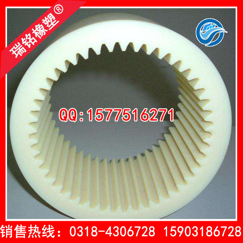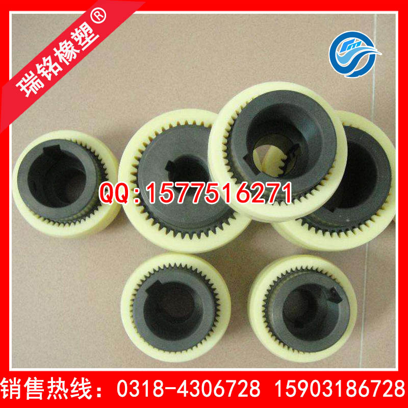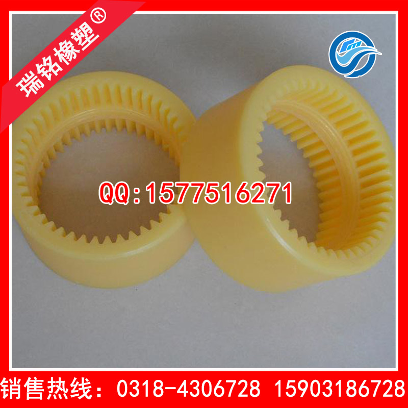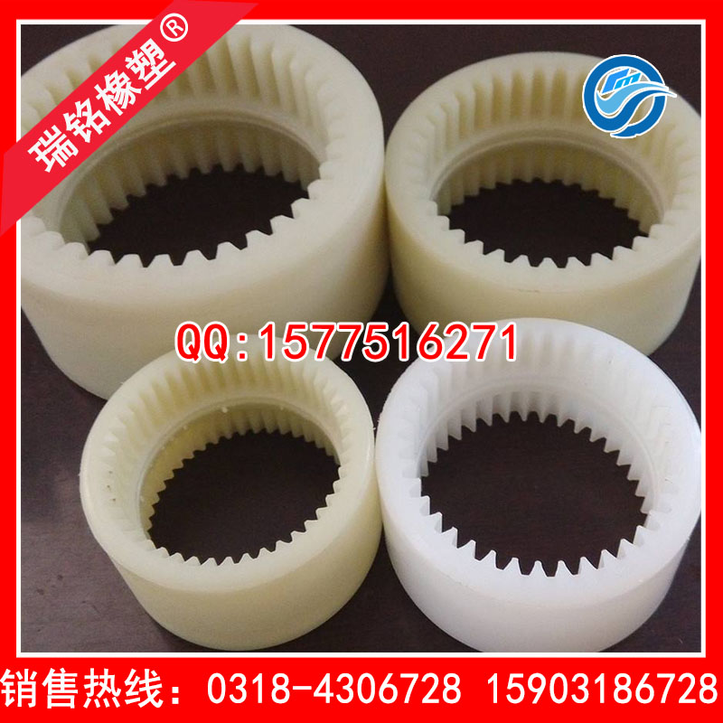 尼龙内齿圈是由带外齿的凸缘半联轴器和齿数相同的内齿圈等零件组成。外齿分为鼓形齿和直齿两种齿形,所谓鼓形齿尼龙内齿圈即为将外齿制成球面,球面中心在齿轮轴线上,齿侧间隙较一般齿轮大,鼓形齿尼龙内齿圈联轴器可允许较大的角位移(相对于直齿联轴器),可改善齿的接触条件,提高传递转矩的能力,延长使用寿命。